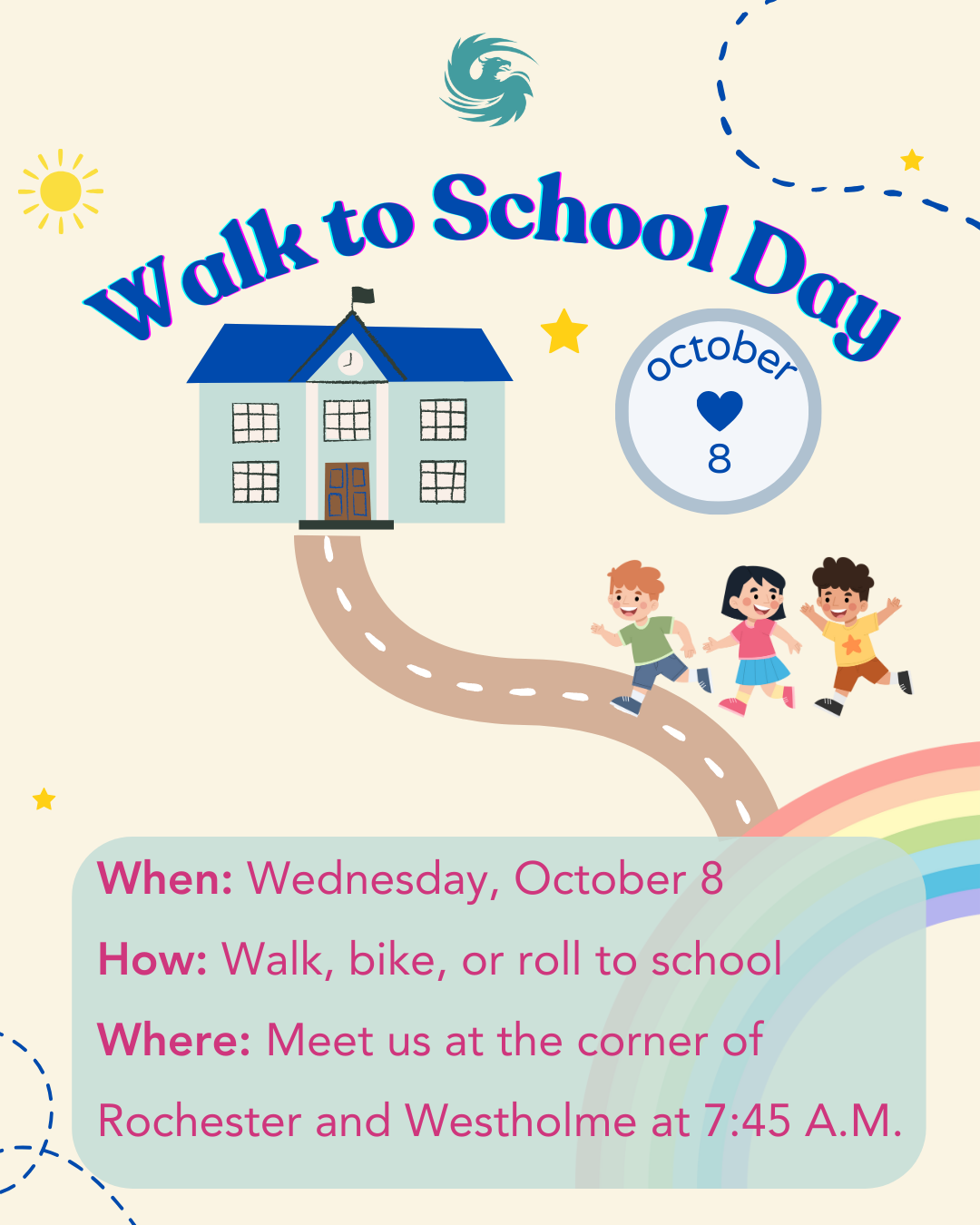 Meet at Westholme & Rochester at 7:45 a.m. on Oct 8, and weโll walk around the school together.