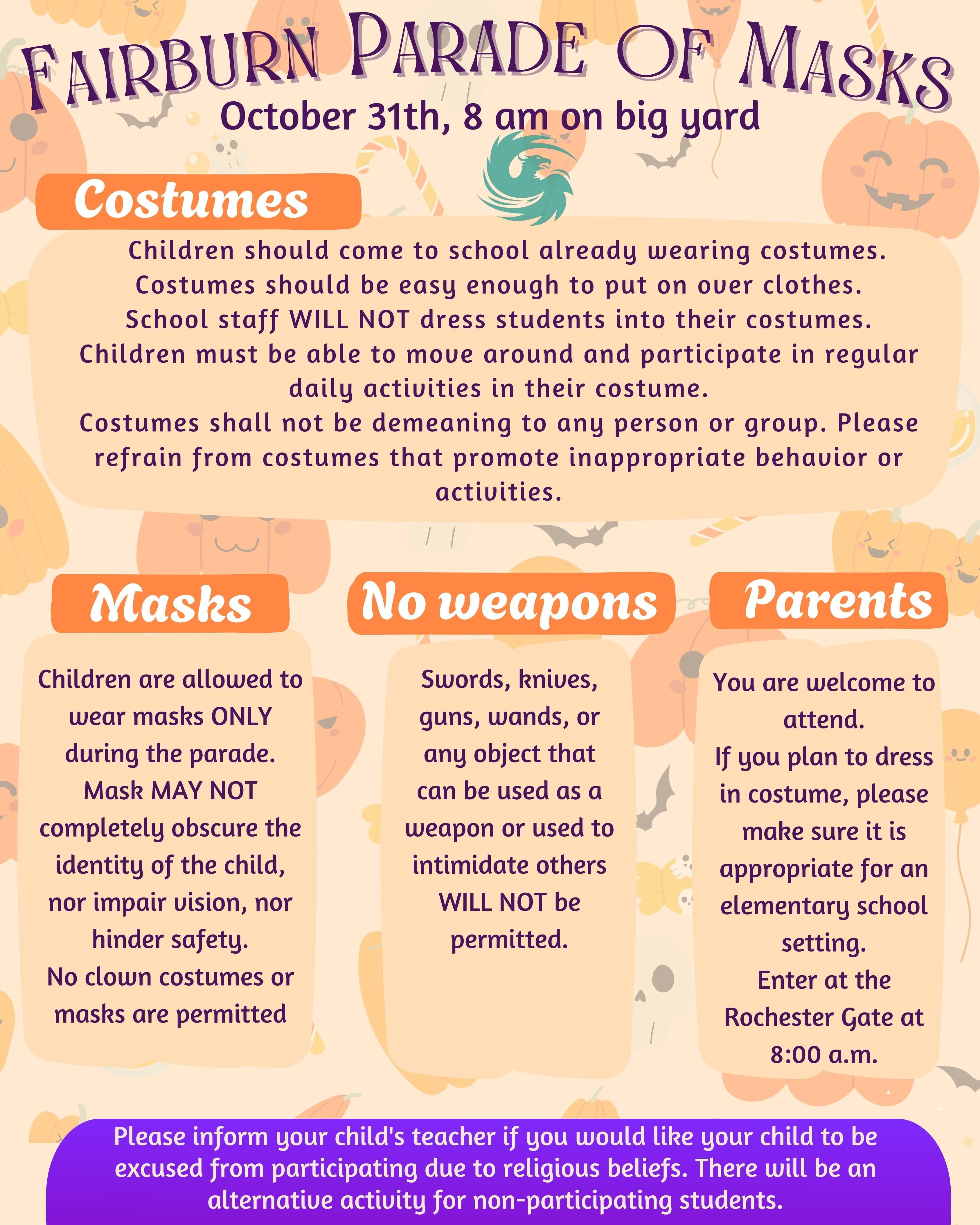 Costumes should be respectful, school-appropriate, and easy to move in. No weapons, replicas, or face painting. Masks may be worn only during the parade and removed afterward.